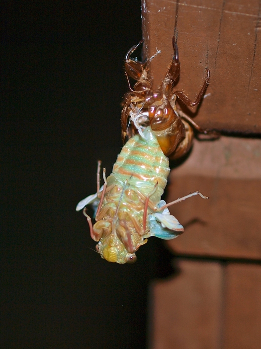 어느 날 여름철 땅 밖으로 나와 사진처럼 나무나 난간? 에 자리를 잡고 우화를 시작한다.